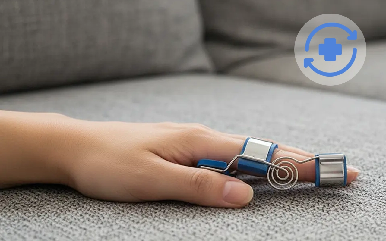 Koripallossa tärähdyksen jälkeen keskisormeni jäi vinoksi. Tukea päivä ja yö käyttäessäni sormi suoristui, ja pystyn taas puristamaan ohjauspyörää.
