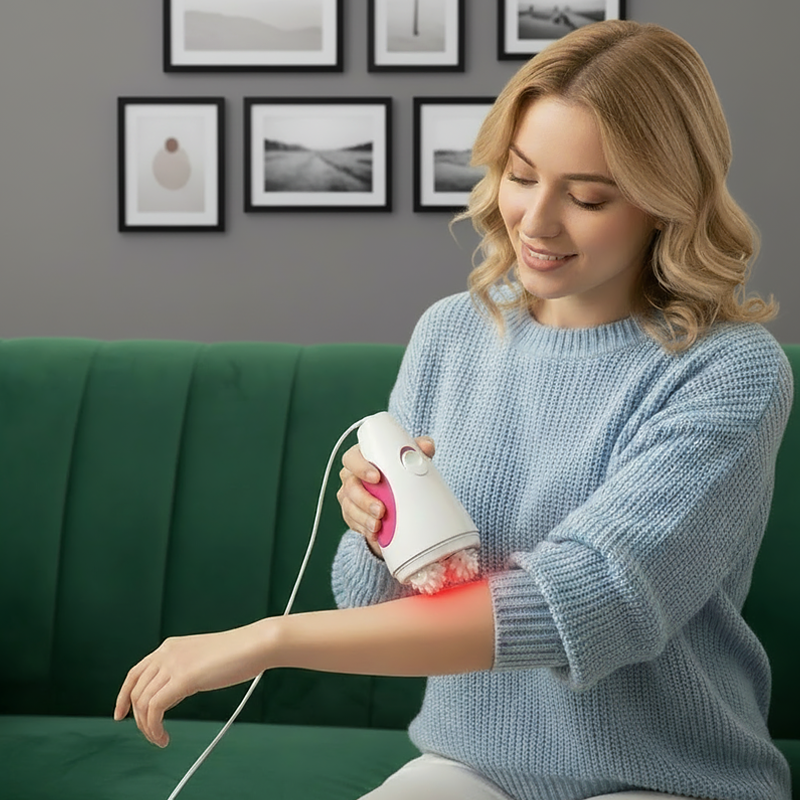 Rakastan tätä laitetta! Saan helposti hierottua käsivarret ja vatsan. Punainen valo tuntuu myös rentouttavalta.