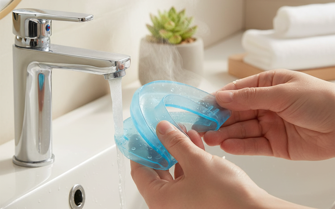 Muotoile geeli hampaisiisi lämpimällä vedellä. Säädä istuvuus hellävaraista tukea varten ilman kipua.