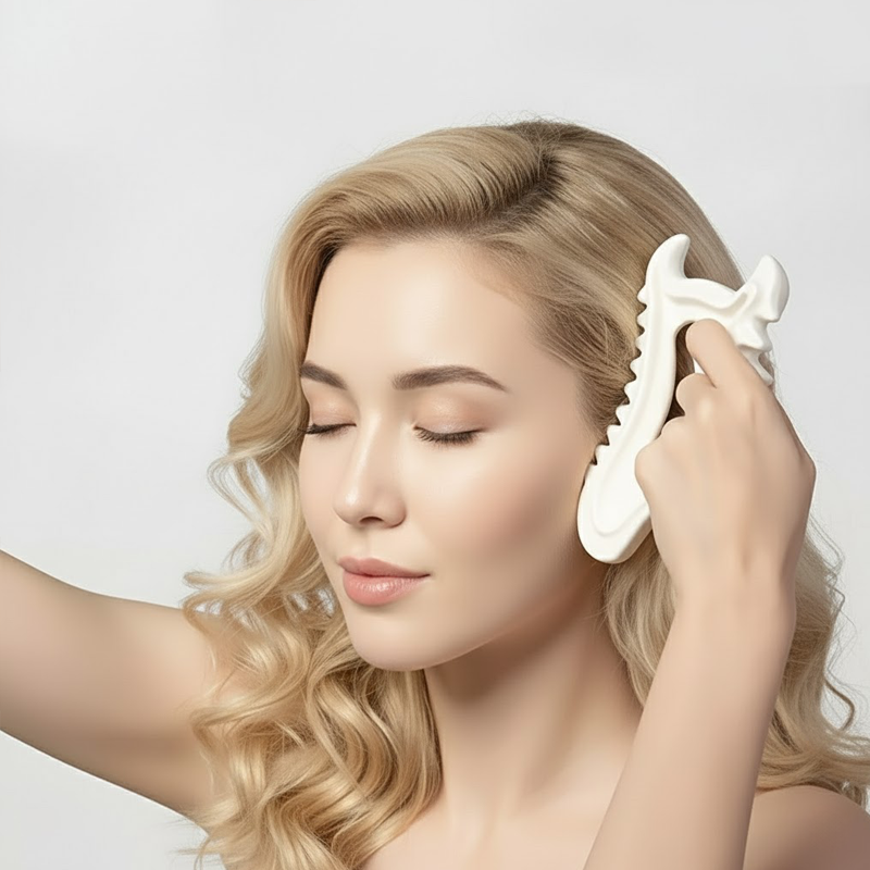 Gua sha saa kasvoni hehkumaan ja näyttämään terveeltä ilman suurta vaivaa. Keramiikka tuntuu aluksi viileältä, mikä on todella rauhoittavaa.