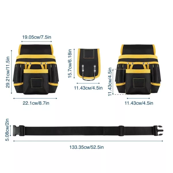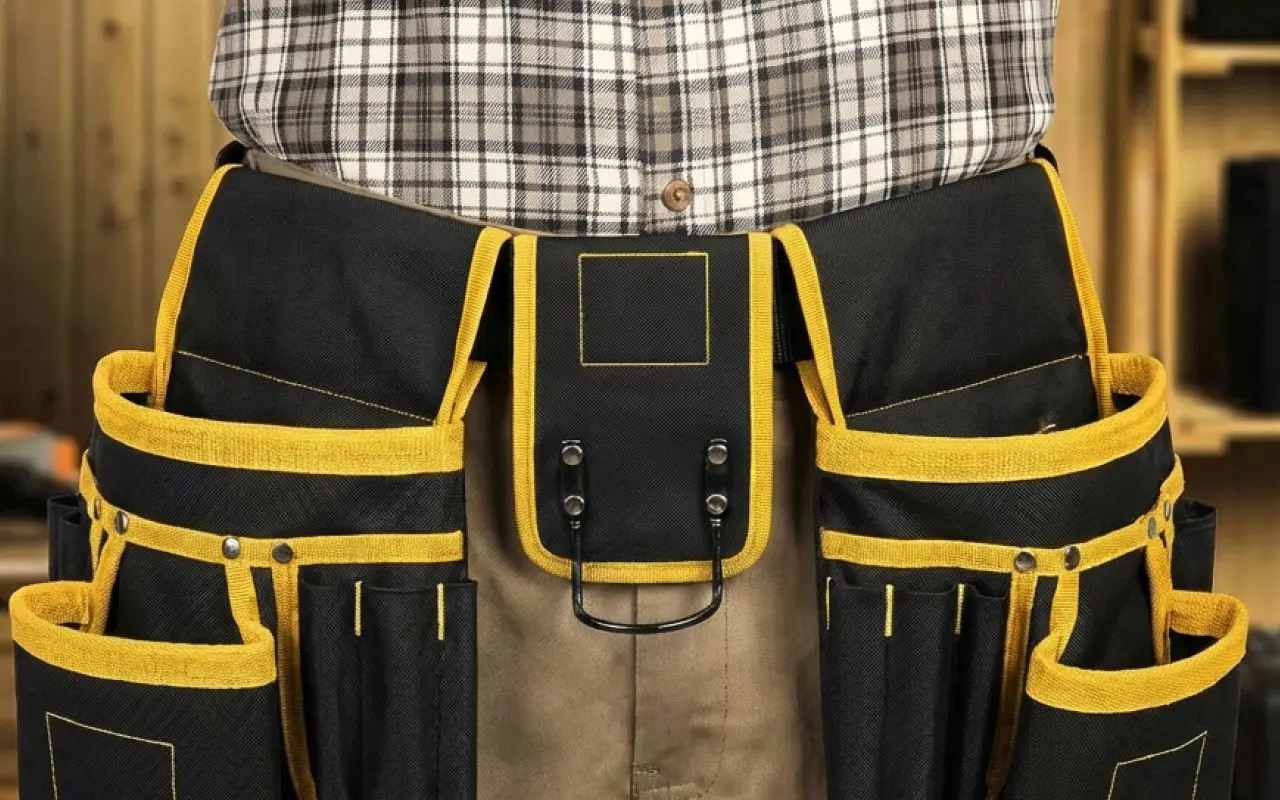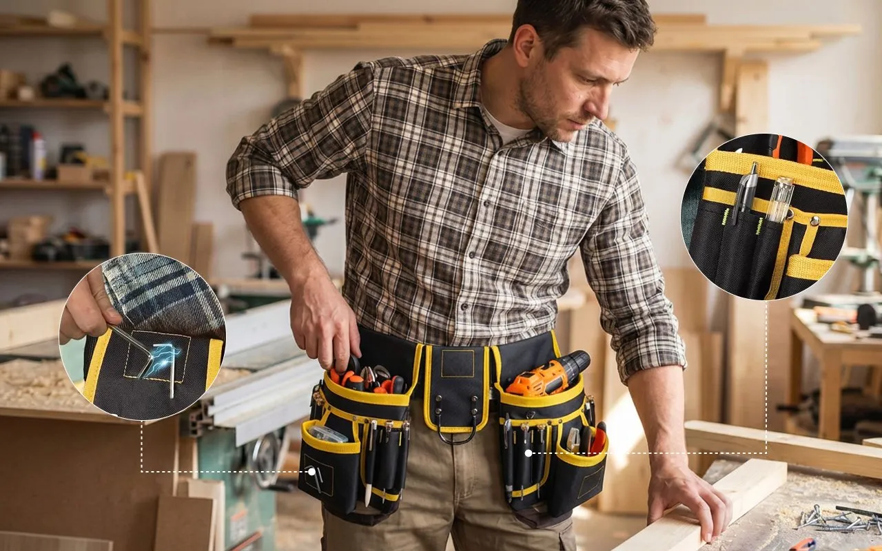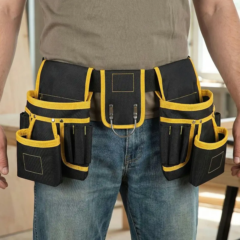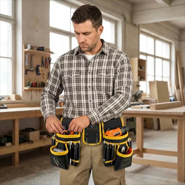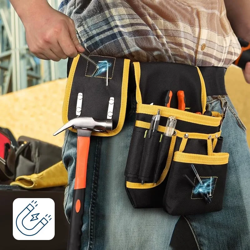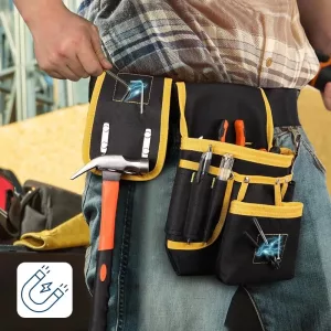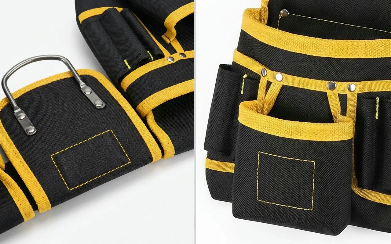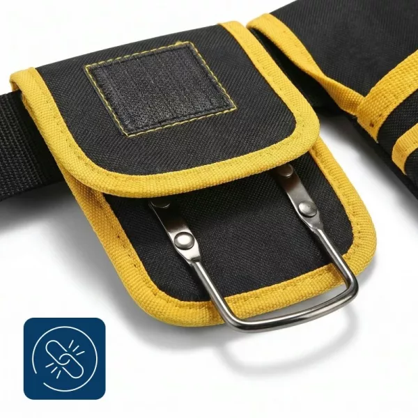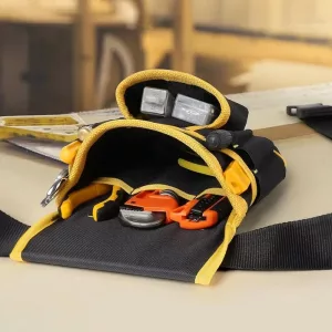 Vahvistetut saumat kestävät raskaita vasaroita, poria ja suurikokoisia tarvikkeita vaivatta. Kestävä kangas hylkii työmaan pölyä ja palvelee rakentajia, sähköasentajia ja putkimiehiä lukemattomien projektien ajan.