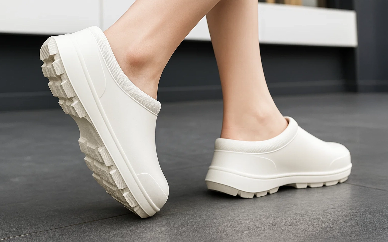 Parhaat keittiökengät joita olen käyttänyt—ei kipeitä nilkkoja, helppoja huuhdella puhtaaksi, eivätkä tunnu painavilta. Rakastan kuinka nopeasti voin liikkua näissä.