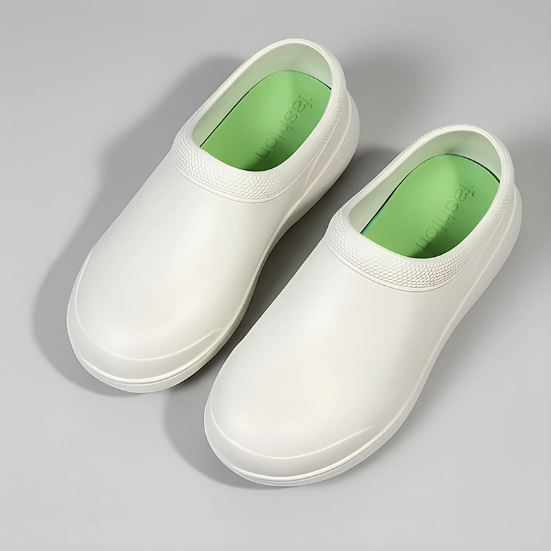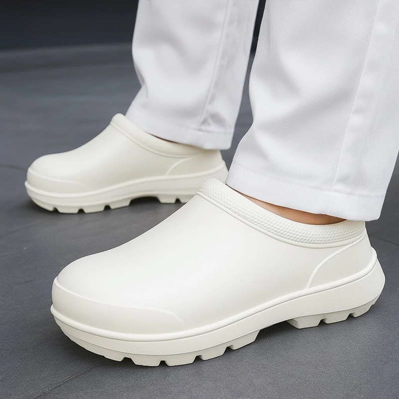 Parhaat keittiökengät joita olen käyttänyt—ei kipeitä nilkkoja, helppoja huuhdella puhtaaksi, eivätkä tunnu painavilta. Rakastan kuinka nopeasti voin liikkua näissä.