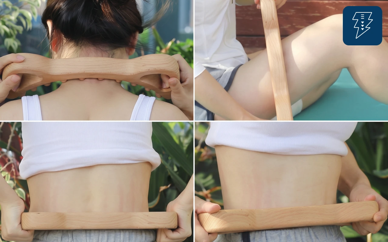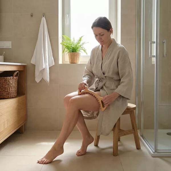Käytän puista työkalua suihkun jälkeen pienen öljymäärän kanssa. Se auttaa polvia ja nilkkoja rentoutumaan ja reiteni näyttävät vähemmän turvonneilta.