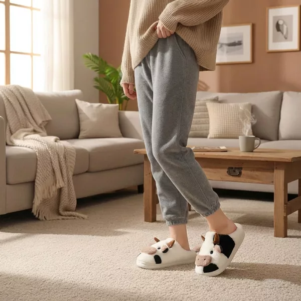 Mukavat lehmätossut ovat loistavat kotona oleskeluun. Vaimoni ja minä käytämme samanlaisia, mikä on aika hauskaa! Liukuestepohja toimii hyvin puulattioillamme.