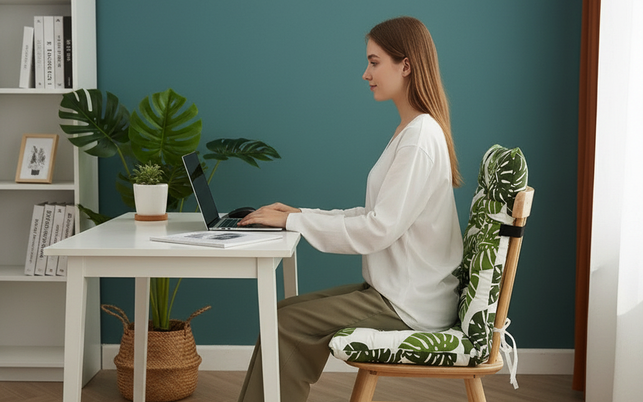 Istun tuntikausia töissä. Selkätuki pitää ryhtini hyvänä ja tekee tuolistani paljon mukavamman. Nyt käytän sitä myös kotona ja autossa.