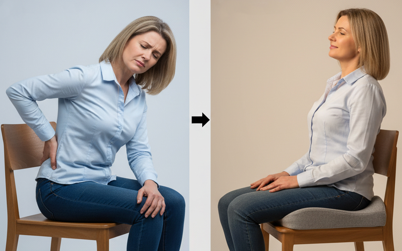 Kohdennettu muistivaahtomuotoilu lievittää kipua nopeasti ja hellästi. Istumisesta tulee jälleen miellyttävää, kun jännitys häviää.