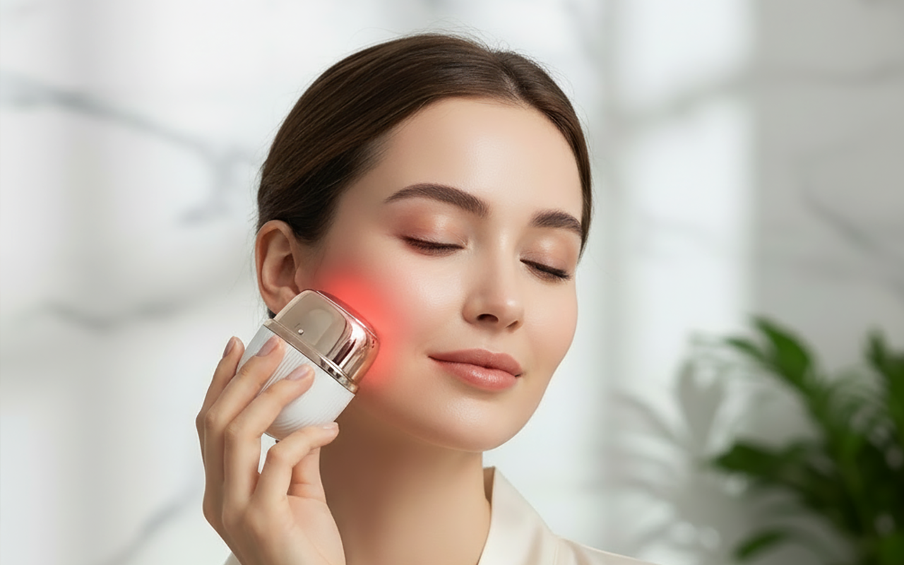 LED-valot auttavat himmeän sävyn häivytyksessä ja lisäävät hehkua. Kolme väriä valoterapiaa tuovat välitöntä kirkkaampaa ilmettä väsyneille kasvoille.