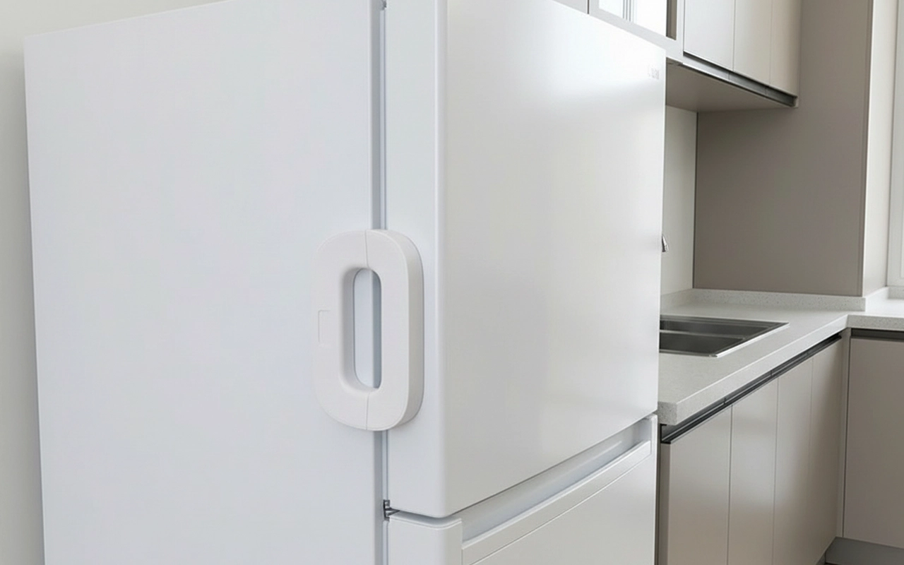 Estää tytärtäni penkomasta jääkaappia. Yksinkertainen painonappi on helppo minulle, vaikea hänelle. Mielenrauhaa joka päivä!