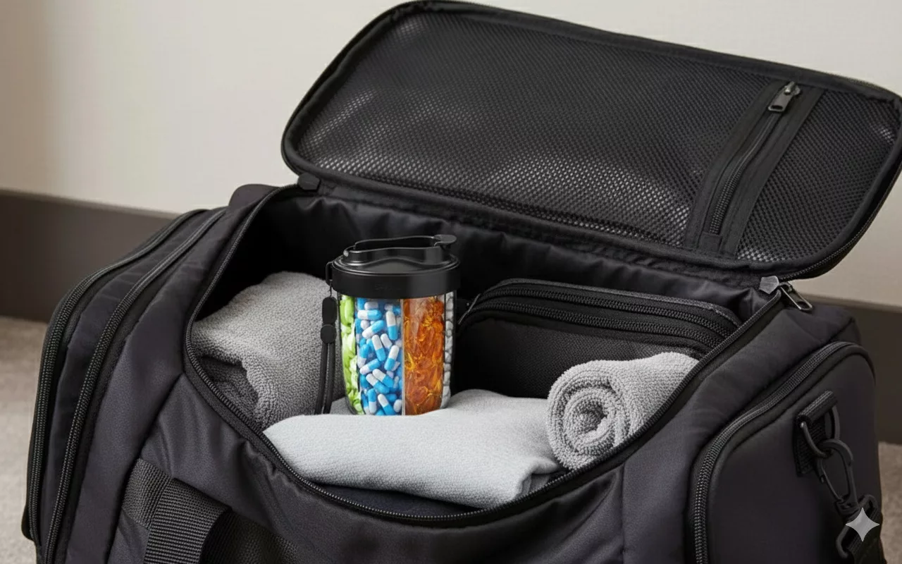 Tämä järjestelijä mahtuu suoraan salikassiini. Pitää pillerit erillään ja on mukavaa tietää, että muovi on turvallista myös välipaloille ja vitamiineille.