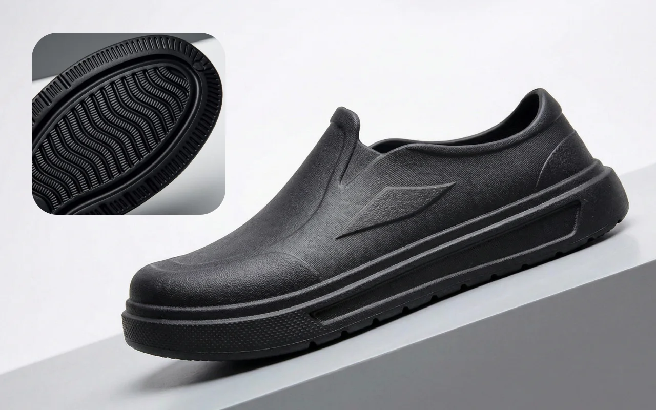 Olen kokki ja keittiön lattiat menevät helposti sotkuisiksi. Nämä kengät pitävät veden ulkona, eivät luista öljyisillä kohdilla ja puhdistuvat helposti pitkien vuorojen jälkeen.