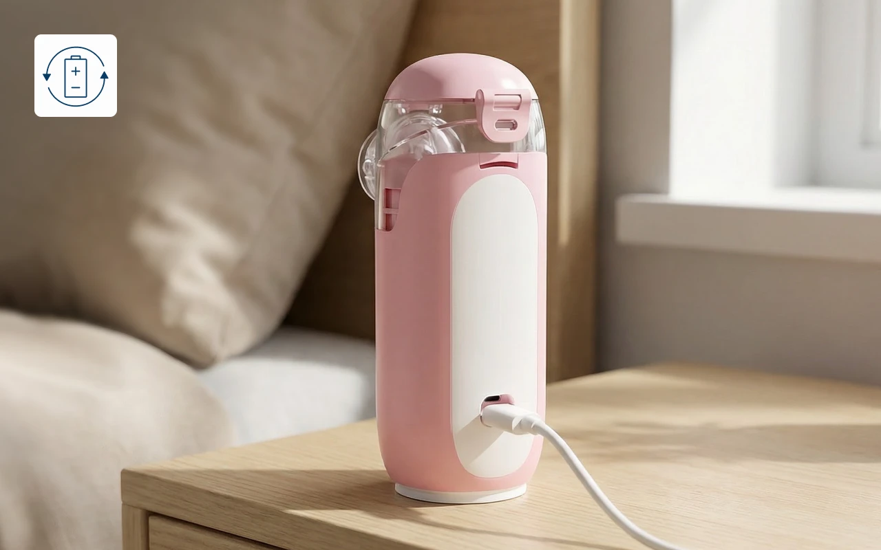 Perheemme säilyttää tätä mini-nebulisaattoria autossa hätätapauksia varten. Se latautuu nopeasti ja on lähes äänetön. Erinomainen flunssaoireiden hallintaan liikkeellä ollessa!