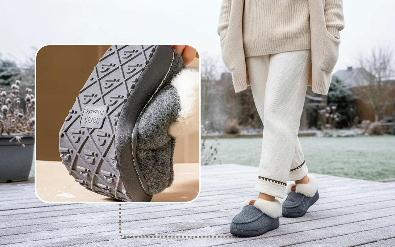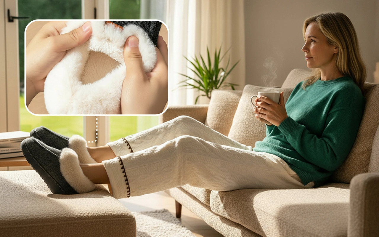 Paksu pehmeä vuori ympäröi jalkasi hellävaraisella pehmeydellä. Täydellinen viileisiin aamuihin tai rentoutumiseen sisällä työpäivän jälkeen.