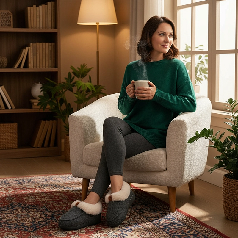 Paksu pehmeä vuori ympäröi jalkasi hellävaraisella pehmeydellä. Täydellinen viileisiin aamuihin tai rentoutumiseen sisällä työpäivän jälkeen.