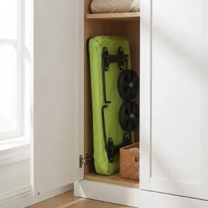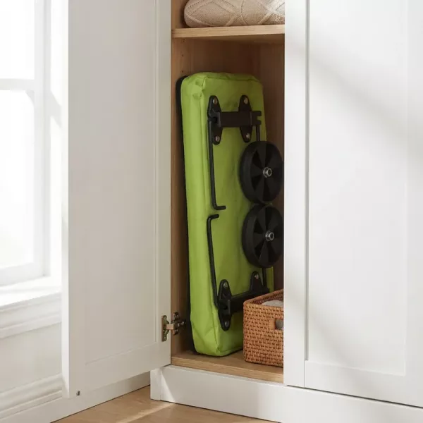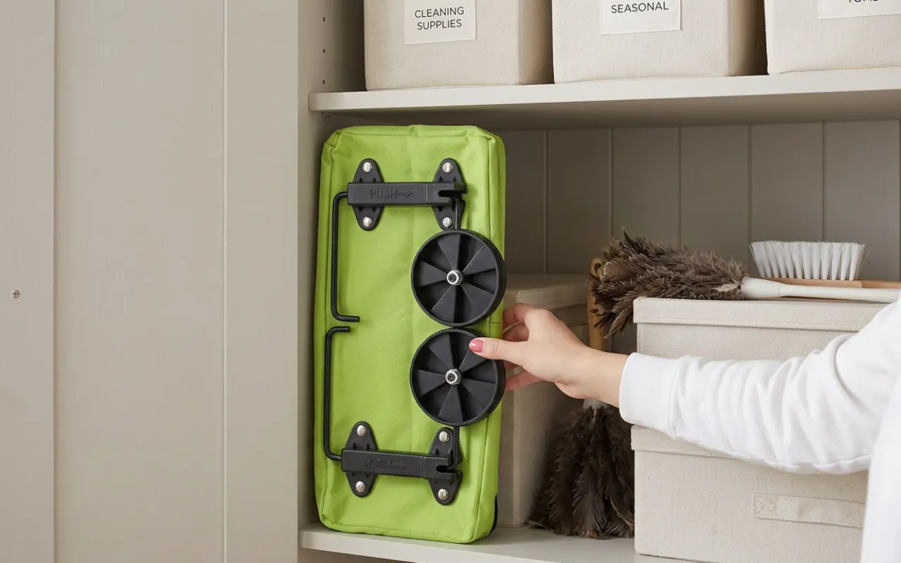 Hankin tämän kärryn olkapääleikkaukseni jälkeen. Nyt voin lastata painavat pullot ja hedelmät ilman huolta. Se taittuu sekunneissa ja liukuu helposti vaatekaapin viereen.