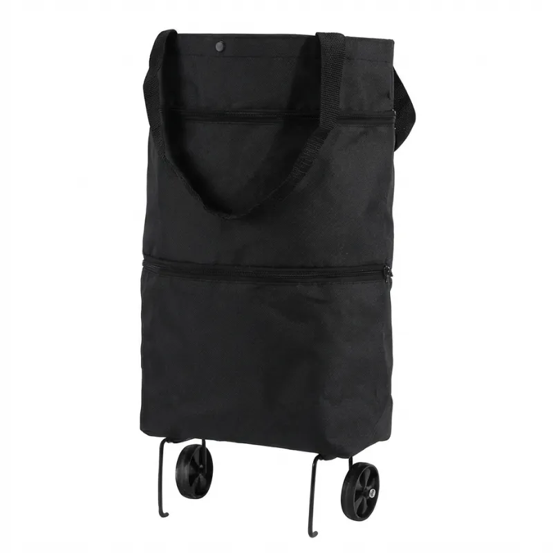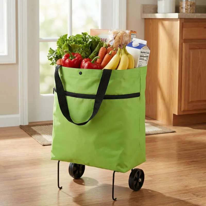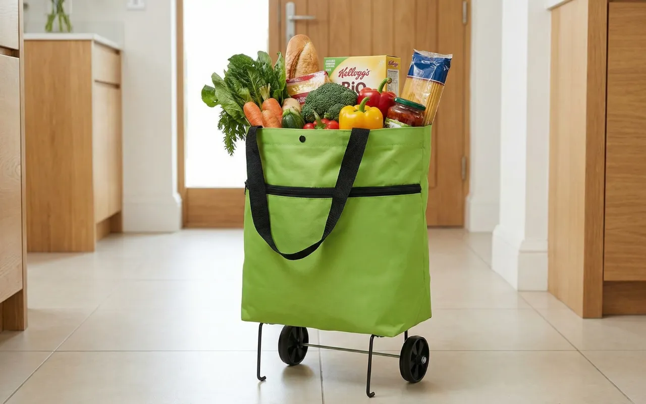 Työnnän tätä kärryä supermarkettiin kahdesti viikossa. Se kantaa maidon, leivän, vihannekset ja siivoustarvikkeet helposti. Tukevan laukun ansiosta mikään ei pääse kaatumaan.