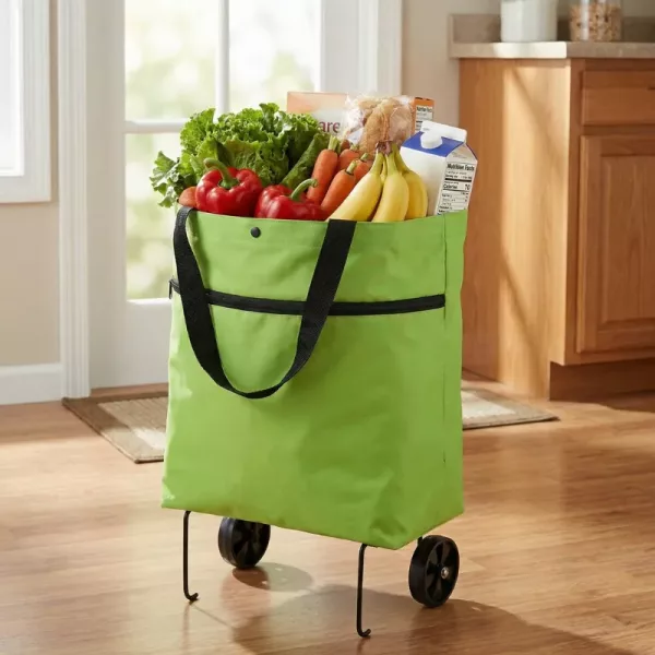 Ostoskärryymme mahtuu useiden kassien verran tavaraa ilman vaarallista notkumista. Kestävä kangas hylkii repeämiä ja suojaa hedelmiä, leipää ja pulloja.