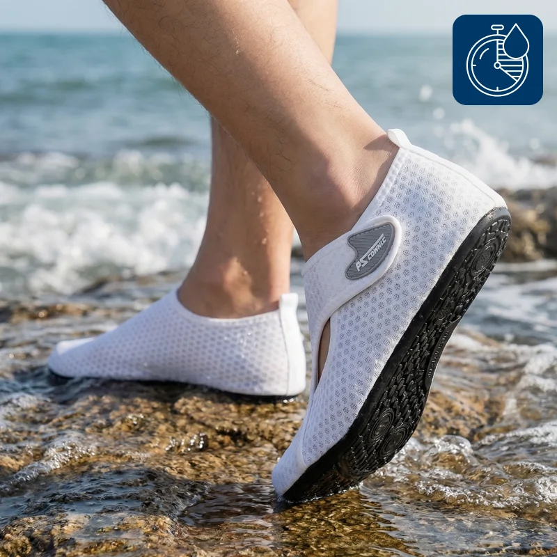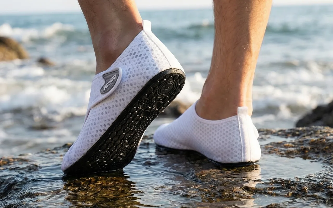 Erityiset pohjat estävät liukastumisen kivillä tai märillä laatoilla. Tunne olosi turvalliseksi missä tahansa liikutkin, uima-altaalta merenrantaan.