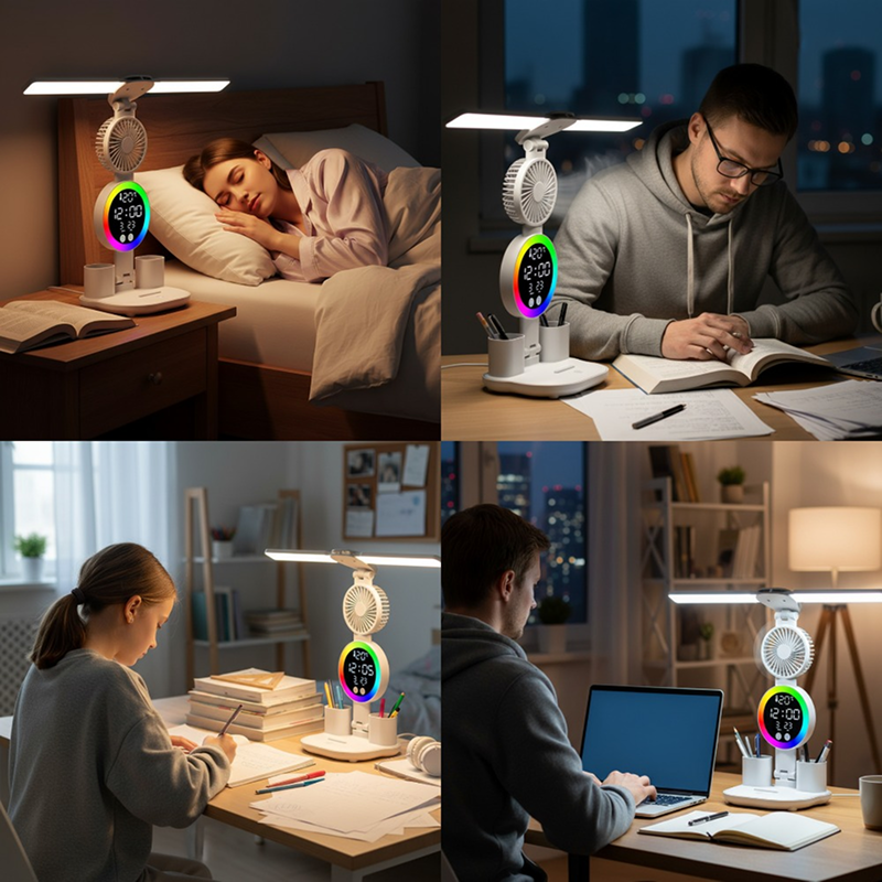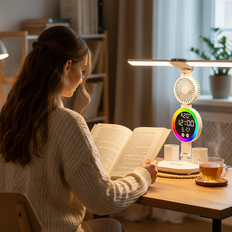 Todella helppo käyttää! Kello on iso ja kirkas, ja tuuletin toimii hiljaisesti. Myöhäisiltaisin lukeminen on nyt paljon mukavampaa.