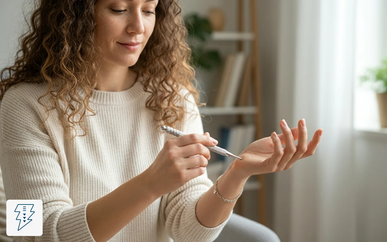 Pitkien seisomavuorojen jälkeen vedän kynää nilkkojeni ja säärieni pitkin. Se antaa lempeää painetta, joka helpottaa särkyä ilman, että tarvitaan paristoja.
