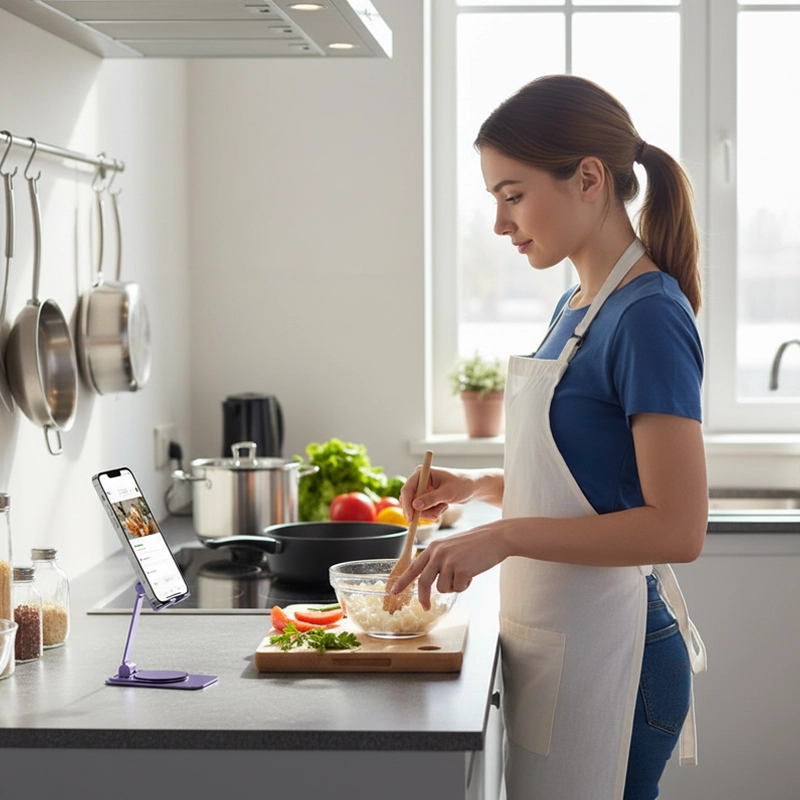 Pidän tätä telinettä keittiön tasolla reseptejä ja videopuheluja varten kokatessa. Se kallistuu sulavasti ja pitää koko työtilani selkeänä.