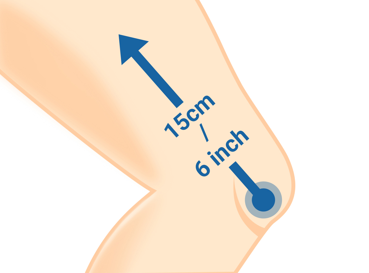 - 2. Aseta mittanauha 15 cm / 6" polvilumpion keskikohdan yläpuolelle ja jatka mittausta nilkkaan asti.