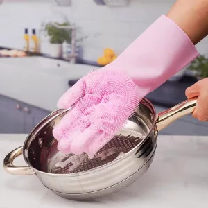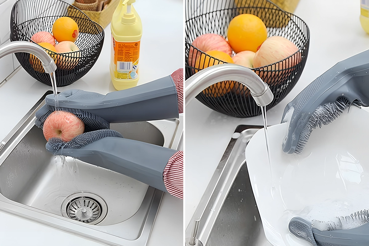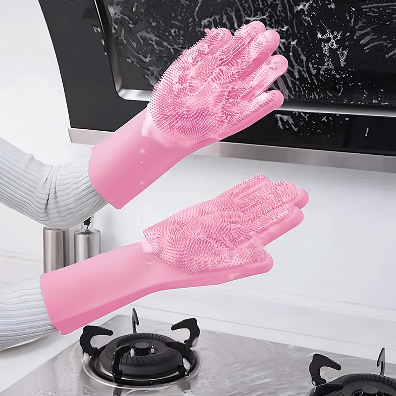Nämä puhdistushanskat poistavat tarpeen erillisille harjoille tai sienille, säästäen aikaasi ja vaivaasi. Ne poistavat ruoantähteet, saippuajäämät ja lian sekunneissa.