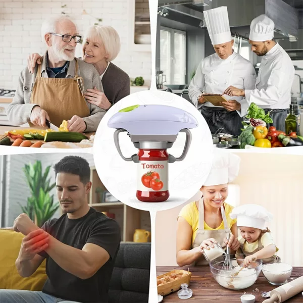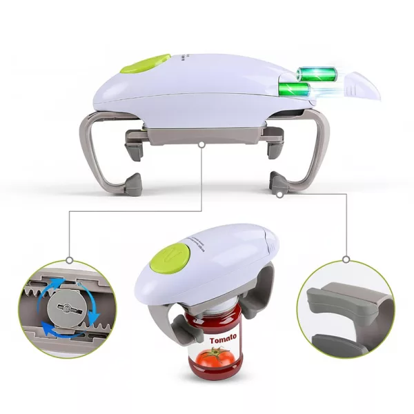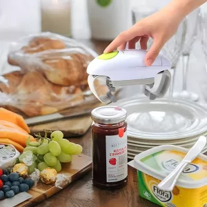 Minulla oli aiemmin vaikeuksia purkkien kanssa, mutta tällä ne avautuvat helposti. Paina vain yhtä nappia, siinä kaikki. Uusi keittiöapulaiseni ehdottomasti.