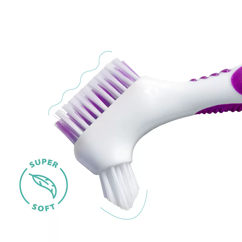 Tämä harja sopii hyvin käteeni ja tekee puhdistamisesta nopeaa. Pidän kaksoisharjapäistä, joilla pääsee joka paikkaan, ja harja tuntuu hellävaraiselta proteeseja vasten.