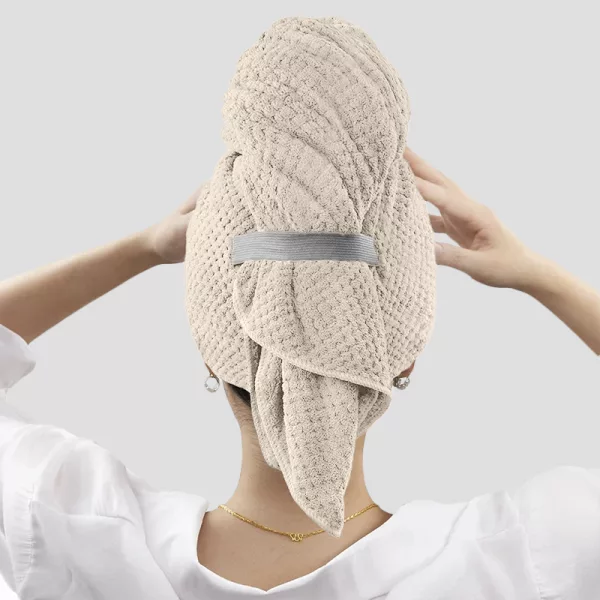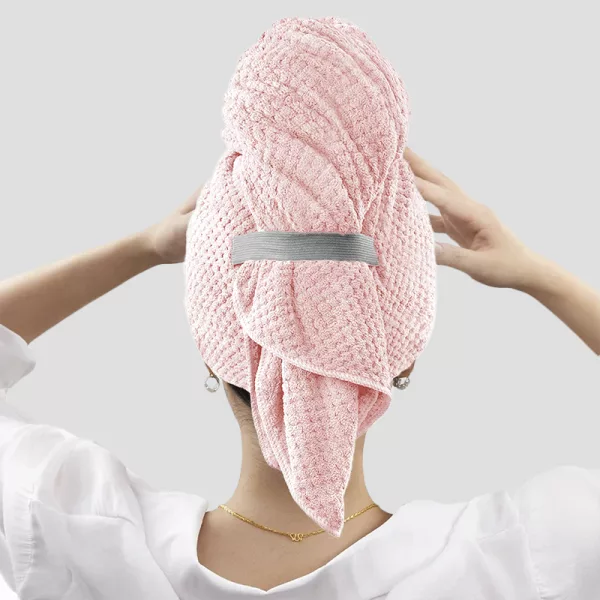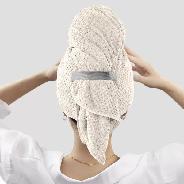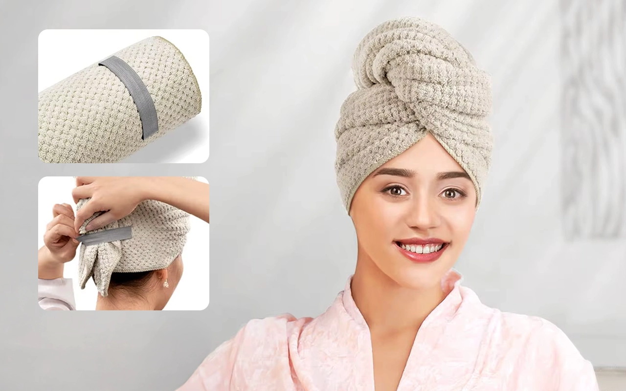 Tämä pyyhe kuivaa paksut hiukseni minuuteissa. Ei tunnu koskaan raskaalta, vaikka olisi märkäkin. Kuminauha on loistava idea, käytän sitä aina.
