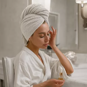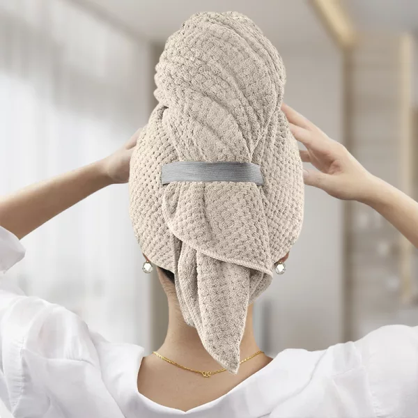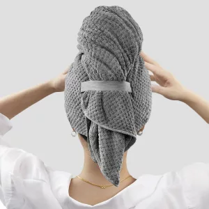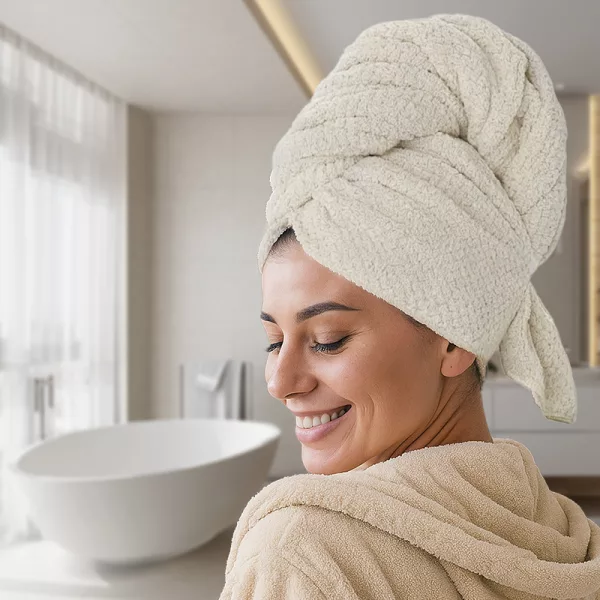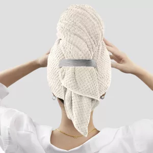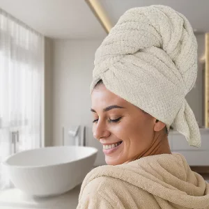 Mikrokuitu on mahtava – hellävarainen päälle ja hiukset kuivuvat todella nopeasti! Ei enää märkiä kohtia tai raskaita pyyhkeitä putoamassa. En vaihtaisi enää pois.