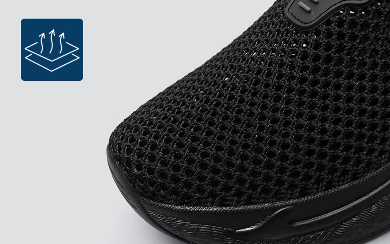 Pehmeä verkkokangas antaa ilman kiertää vapaasti ja pitää jalat kuivina. Pohjalliset vaimentavat iskuja ja vähentävät painetta koko päivän ajan.