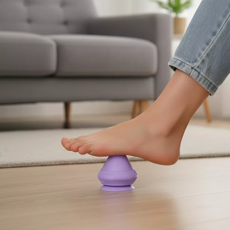Lasten perässä juoksemisen jälkeen tällä pallolla jalkojen rullaaminen tekee suuren eron. Imukuppi pitää sen paikallaan sekä istuessa että seistessä.