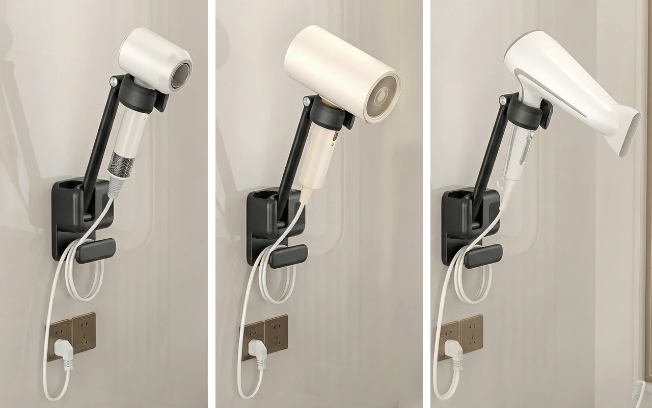 Yhteensopiva erikokoisten hiustenkuivaajien kanssa vaivatonta käyttöä varten. Vaihda laitteita helposti ilman huolta yhteensopivista pidikkeistä.