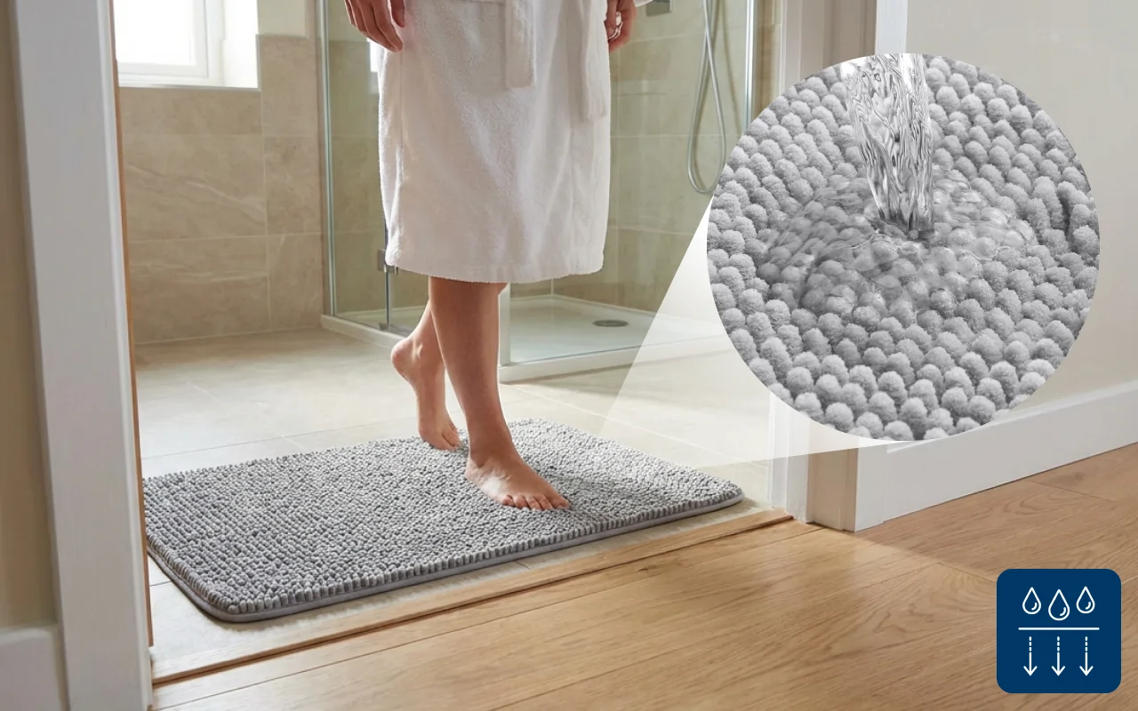 Kosteus imeytyy nopeasti ja pitää pinnat kuivina ja turvallisina. Jäähyväiset märille jalanjäljille ja tervetuloa tahrattomiin huoneisiin.