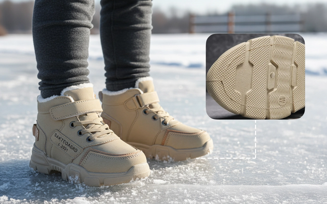 Erikoissuunnitellut pohjat pitävät hyvin estäen turhat kaatumiset. Lapset voivat juosta, hyppiä ja kävellä turvallisesti liukkailla alustoilla ulkona.
