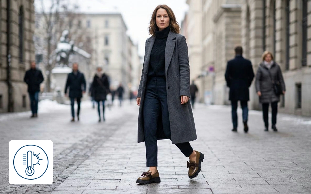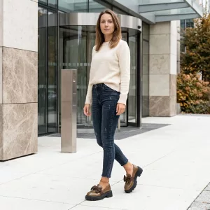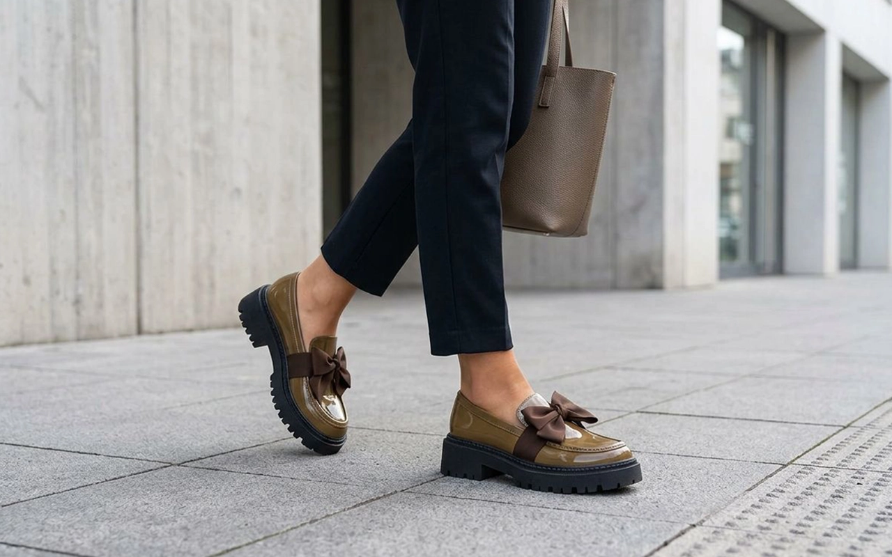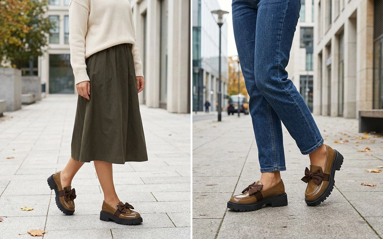 Ostin nämä loafereita työmatkaa varten, ja jalkani pysyvät lämpiminä ja mukavina jopa pitkien kävelyiden aikana. Rusetti saa yksinkertaisen asun näyttämään huolitellummalta.