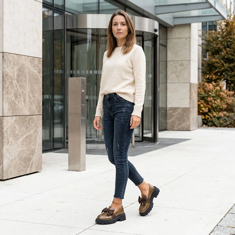 Ostin nämä loafereita työmatkaa varten, ja jalkani pysyvät lämpiminä ja mukavina jopa pitkien kävelyiden aikana. Rusetti saa yksinkertaisen asun näyttämään huolitellummalta.